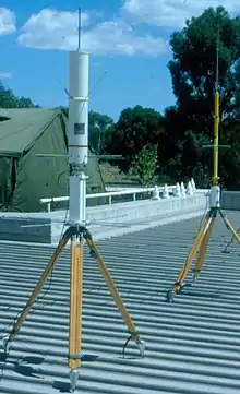 GPS TI4100 geodetic receiver antennas (6) in the background on the concrete behind TRANSIT Doppler satellite AN/PRR-14 geodetic receiver (Geoceiver) antenna on tripod (left) and TRANSIT Doppler satellite MX1502 geodetic receiver (second generation) antenna on tripod (right)