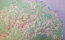In January 1943 the section was retitled 8th Aust Field Survey Section AIF. In March a sub-section flew into Wau as part of Kanga Force remaining there for more than six months in direct support of the combat troops in the Wau-Bulolo-Salamaua areas. All methods of field survey were used, much based on the urgency of the need: astronomy, triangulation, theodolite and chain traverse, plane-tabling, compass traverse, levelling, trigonometric heighting, barometry, intersection of prominent features behind the enemy to improve artillery targeting. A narrow triangulation chain was carried from the astronomic datum at Wau, north through Bulolo into the Markham Valley in anticipation of the Australian attacks on Japanese held Lae. In October the sub-section was to be relieved and they walked out 110km to the south coast on the Wau-Bulldog road and then by steamer to Port Moresby. After sixteen months of active service 8 Aust Fd Svy Sect was absorbed as No 2 Field Section of 6th Aust Army Topographic Survey Company and moved to Australia.[7][8] On 19 October 1943, General D MacArthur, Commander-in-Chief, South West Pacific Area, highly commended 2/1 Aust Army Topo Svy Coy AIF, 3 Aust Fd Svy Coy AIF, a detachment 69th US Engr Topo Coy and 8 Aust Fd Svy Sect AIF for their worthy efforts in supporting the campaigns: Kokoda, Milne Bay, Gona-Sanananda-Buna, Wau-Salamaua, Lae and the Huon Peninsula. "Great technical difficulties were surmounted in producing and distributing maps and photomaps covering more than twelve thousand square miles in time for operations, from combat type photography never before used in this theatre. Astronomic locations vital to the success of the other Allied mapping efforts were obtained under conditions of hardship and grave difficulties of transportation and, upon occasions, considerable risk. This untiring effort to provide the combat units with the maps needed when they were needed, from the material at hand, reflects great credit upon the officers and men of these organisations".[1] Together Australian and United States Army survey units produced nearly 400 surveyed maps for military operations in Papua, New Guinea, New Britain, New Ireland and Bougainville.