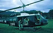 RAAF Iroquois helicopter at Igam Barracks, Lae – topographic surveyors prepared for an early morning sortie to field check preliminary 1:100,000 maps.
