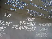 Some of the written statements reflecting controversial views inscribed in the memorial include: "Erroneous U.S. Airstrike Kills 46 Uruzgan Civilians", "Congress Questions Why CIA and FBI Didn't Prevent Attacks", "Middle East violence motivates attacks in the US", and "You Don't Win Battles of Terrorism With More Battles".[3] Rep. Russell Pearce, R-Mesa, said he was stunned to learn of the inscriptions. "To politicize it to me is absolutely outrageous, instead of a memorial to remember those who have sacrificed their lives," he said.[4] The memorial's design was also criticized by Len Munsil, who was running against Napolitano for Arizona Governor at the time of the design unveiling.