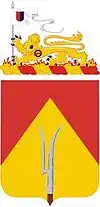 - Shield: The shield is divided scarlet and yellow, scarlet being the Artillery color and yellow the color of Artillery guidon markings. The charge shown is known as a guisarme, a weapon used in ancient times to reach the enemy behind the defense. It symbolizes the operations of the organization.