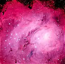 9 Sgr is a naked eye star lying in the direction of the Lagoon Nebula (Messier 8), very close to the central condensation of the Hourglass Nebula around Herschel 36. It was not catalogued by Bayer with a Greek letter, but was listed by Flamsteed as number 9 in the constellation Sagittarius. It lies close to the open cluster NGC 6530. 9 Sgr is the main source of ionisation for much of the visible nebulosity in the region, although the young O star Herschel 36 ionises the dense Hourglass Nebula region.[8]
