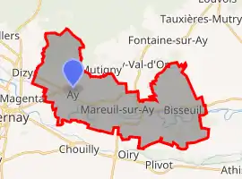 Aÿ-Champagne (French pronunciation: [a.i ʃɑ̃paɲ]) is a commune in the Marne department, northern France. The municipality was established on 1 January 2016 and consists of the former communes of Aÿ, Mareuil-sur-Ay, and Bisseuil.[2] They keep their names and town halls.