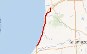When auto trails were being developed in the early 20th century, the path of the modern A-2 was used for part of two. The first in 1912 was the West Michigan Pike, which ran from the Indiana state line north to the Straits of Mackinac along Lake Michigan.[5] The second was the Western Mainline of the Dixie Highway in 1915.[6] The state legislature created the State Trunkline Highway System on May 13, 1913, and in the legislation, Division 5 corresponded to a highway along the western Lower Peninsula near Lake Michigan.[7] Six years later, the system was signposted for the first time,[8] and the original M-11 ran along the former Division 5.[9] In November 1926, the American Association of State Highway Officials approved the United States Numbered Highway System,[10] and the state designated US 31 in Michigan along M-11.[11] During World War II, the state highway department bypassed downtown South Haven, shifting US 31 out of downtown.[12][13] US 31 was given the Blue Star Highway designation on October 10, 1948.[14]