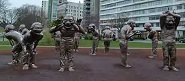 A-maze-ing Laughter was designed by Yue Minjun and installed in Morton Park (Davie and Denman) along the English Bay in West End, Vancouver in 2009. The patinated bronze sculpture, composed of 14 statues each about three meters tall and weighing over 250 kilograms,[4] portrays the artist's own image "in a state of hysterical laughter".[1] It was created as part of the Vancouver International Sculpture Biennale, which exhibits international contemporary works in public spaces. The sculpture was donated to the City of Vancouver by Chip and Shannon Wilson through the Wilson5 Foundation on August 11, 2012.[1]