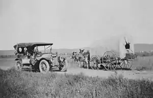 Covered wagon with jackrabbit mules encounters an automobile on the trail near Big Springs, Nebraska by A. L. Westgard, 1912