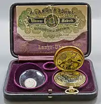 A. Lange & Söhne is a trademark of Lange Uhren GmbH, a German manufacturer of luxury and prestige watches.[2][3][4] The company was originally founded by Ferdinand Adolph Lange in Glashütte, Kingdom of Saxony in 1845.[5][6] The original A. Lange & Söhne was nationalized and ceased to exist in 1948, following the occupation by the Soviet Union after World War II.[5][6] The current A. Lange & Söhne trademark was re-registered when Lange Uhren GmbH was founded in 1990 by Walter Lange, the great-grandson of Ferdinand Adolph Lange.[3][5][6]