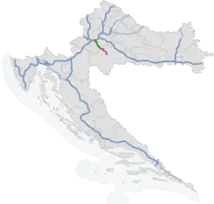 The A11 motorway is an incomplete north–south motorway in Croatia, spanning D30 and D31 state roads south of Velika Gorica.[1] The designed motorway route is of regional importance as it is planned to gradually take over traffic from state road network in the area, especially the D30 which carries a significant commuter traffic volume between Zagreb, Velika Gorica and Sisak. As of January 2016, 30 kilometres (19 miles) of the route are open to traffic, connecting the D31 and the D30 roads at Velika Gorica and Poljana Lekenička exits respectively. The D30 and the D31 have a shared intersection in Velika Gorica itself, providing an alternative route to the motorway section.[2][3] Legally designated termini of the A11 motorway are the Jakuševec interchange on the Zagreb bypass and Sisak.[2]