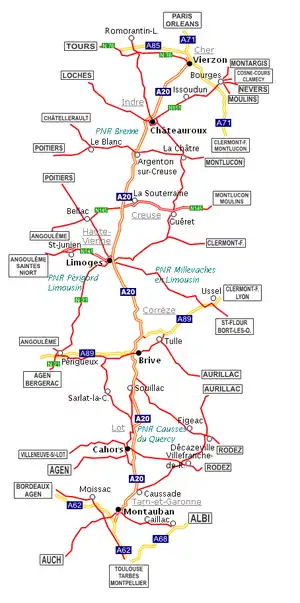 The A20 autoroute or L'Occitane is a highway through central France. A part of France's national network of autoroutes, it is 427 kilometres (265 mi) long.
