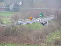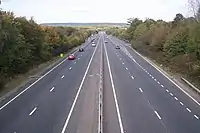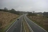 Between 1988 and 2017, the Tonbridge bypass and the Pembury bypass were separated by a 1.7 miles (2.7 km) section of 7.3m wide single carriageway with no footways or verges. Severe congestion was frequent[12] as this stretch carried an average of 35,000 vehicles each day, significantly higher than its original capacity, and the number of accidents occurring on this road was above the national average. There were proposals to upgrade this section of A21 to a dual carriageway standard following the Pembury bypasses completion, however they were delayed multiple times.[13][14] In the 2000s, an upgrade scheme was proposed by the Highways Agency, and in 2013 it underwent public enquiry.[15] The scheme layout followed the existing carriageway and involved the construction of a pedestrian and cycle route along its whole length, as well as upgrading the Longfield Road roundabout into a grade-separated Roundabout interchange. £92million of government money was made available to the scheme in July 2013.[16] Preparatory works started in September 2014,[17] which involved nine hectares of ancient woodland being removed. Trees and shrubs were relocated to adjacent land and nesting boxes were installed to protect endangered species such as the dormouse. As a result of the widening of the carriageway a number of buildings were demolished, including a Grade 2 listed 18th century barn. Completion of the scheme was delayed in late 2016 after the discovery of asbestos contamination.[18] The improved road opened in September 2017.[19]