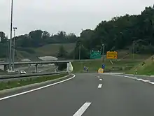 As the route traverses hilly terrain, it requires a substantial number of viaducts and tunnels, as well as two major bridges to span the Drava and Mura rivers. The motorway consists of two traffic lanes and an emergency lane in each driving direction separated by a central reservation. There are no emergency lanes in the tunnels. All intersections of the A4 motorway are grade separated. As of October 2010, there are 12 exits and 3 rest areas operating along the route.[9] As the motorway is tolled using a ticket system, each exit includes a toll plaza. Exits south of the Sveta Helena mainline toll plaza have no toll plazas, as that part of the A4 route is not tolled. The same applies to the northernmost section between the Goričan exit and the Hungarian border.[10]