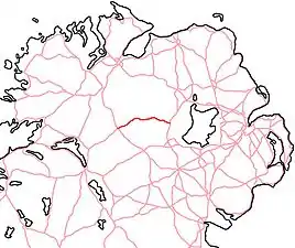 The A505 is an east–west route in County Tyrone, in Northern Ireland. It starts in Omagh, the county town, from where it goes in the direction of Cookstown in the east of the county. The road passes Killyclogher, Mountfield, Creggan, Dunnamore, and Kildress.