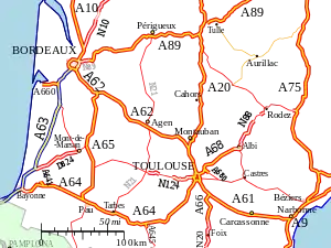 The A63 autoroute is a motorway in southwest France, connecting Bordeaux (from Junction 15 of the Rocade) to the border with Spain. The motorway, rather than being a purpose built route, is an upgrade of the former RN10 which became a full toll road and no longer exists south of Bordeaux.[1] The motorway crosses Les Landes (moorland) as a dual-carriageway.