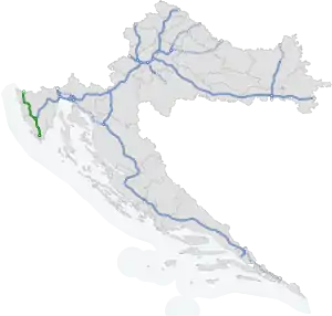 The motorway runs for 78.3 kilometres (48.7 miles) between the border crossing access roundabout—the junction of the D200 and D510 state roads—at its northern end and the D66 state road serving Pula and Pula Airport at its southern end. The route connects towns and resorts in the western, southern and central parts of Istria through a total of 9 interchanges and the state road network acting as feeder roads. The route largely runs about 5 kilometres (3.1 miles) inland relative to the west coast of Istria, serving a number of tourist resorts, such as Savudrija and Umag via the eponymous interchange with the Ž5002 and Ž5003 county roads, and Novigrad via the D301. There is also an alternate, southern link to Umag via the D300 state road. This part of the route generally follows a north–south path as it approaches Mirna river. After crossing the river the route turns southeast towards Višnjan. Thereafter, the A9 route resumes the original north–south orientation to Baderna interchange with the D302 road serving Poreč and Medaki interchange with the D21 road. The D21 runs generally parallel to the A9 and it is accessible from all A9 interchanges directly or through short connectors. From there, the route again turns to the southeast to cross the Lim valley. After crossing the valley, which is spanned by the Limska Draga Viaduct it reaches the Kanfanar interchange. The interchange is a junction of the A9 and the A8 routes forming the Istrian Y system, while providing access to Rovinj via the D303 road. Between Kanfanar and Pula, the route turns more to the south and gradually approaches the west coast of the peninsula, bypassing Vodnjan and providing access to Fažana and Brijuni National Park. The route terminates in Pula interchange with the D66 road and the Pula bypass road.[4][5][6][7]