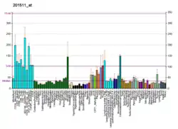 The gene is located on the second human chromosome, near the end of the chromosome's arm (2q35), between the codons 85-87 and 1387-1389. It contains 6042 bp and 11 exons[6] When transcribed, it gives a 1859 bp mRNA. .[6] The vascular endothelial growth factor is a promoting factor of the protein synthesis and localisation in the different parts of the cells.[9] The protein's expression is higher in the intracellular than in the extracellular space.[7]