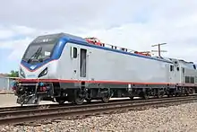 The locomotives are able to operate from the 25 kV 60 Hz, 12.5 kV 60 Hz, and 12 kV 25 Hz power supplies used on the Northeast Corridor, and have a maximum power of 6,400 kilowatts (8,600 hp).[7] The locomotives are designed to be capable of accelerating 18 Amfleet cars to maximum speeds as high as 125 mph (201 km/h) on the Northeast Corridor in a little over eight minutes,[8] with trains of eight Amfleets taking two and a half minutes to reach the same speed.[9] They had advanced safety systems, including specialized couplers designed to keep trains from rolling over, jackknifing, or derailing during a collision.[10] Additionally, the new locomotives are more energy-efficient than those that they replace, and lack dynamic braking grids in favor of 100% regenerative braking, depending on grid receptiveness. Energy generated from the brake may also be used to meet HEP needs, further reducing current draw from the grid.[10]
