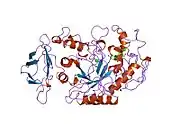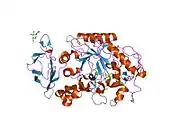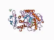 - Qian M, Haser R, Buisson G, et al. (1994). "The active center of a mammalian alpha-amylase. Structure of the complex of a pancreatic alpha-amylase with a carbohydrate inhibitor refined to 2.2-A resolution". Biochemistry. 33 (20): 6284–94. doi:10.1021/bi00186a031. PMID 8193143.