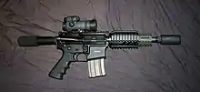 Colt's Manufacturing Company began marketing the Colt AR-15 self-loading rifle in 1964.[1] These rifles were assembled from interchangeable parts designed to allow replacement of malfunctioning parts without the gunsmith skills and tools required for most firearms. Other manufacturers produced similar parts with features not found on production rifles.[2] Some of these parts can be assembled to create firearms with overall length or barrel-length shorter than rifle dimensions specified by law. These small firearms may be defined as pistols by local laws.[3]
