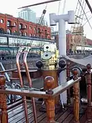 In 1903 the ship was extensively refitted specifically as a steam rescue ship with auxiliary sail propulsion.[note 6] The original horizontal reciprocating engine[note 7] was replaced with a more compact yet more powerful engine and boilers salvaged from a wreck, allowing addition of more water storage, coal bunkering and fuel oil for heating. Additional bulkheads to create a total of eight compartments and hull reinforcement were added. The bilge keels were removed to facilitate damage-free passage through ice. Hard shell above deck storm and wave protection for crew was added fore and aft. Additional insulations of cork and sawdust were added.[2]