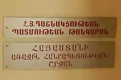 The museum displays government documents, stamps and other artifacts. The first of its exhibits is dedicated to the Democratic Republic of Armenia of 1918 to 1920. It displays official documents presented by Armenia at the Treaty of Versailles in 1919 as well as personal effects from the first republic's prime ministers; Hamo Ohanjanyan, Alexander Khatisyan, Simon Vratsian and Hovhannes Katchaznouni. Personal effects from generals Andranik Ozanyan and Drastamat Kanayan are among the highlights of the exhibit as well.[1]