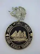 In the ring formed by the two circles there are two inscriptions: reading Armada de México (Mexican Navy) on the top, and Buque Escuela Cuauhtémoc (Cuauhtémoc School Ship), on the bottom.