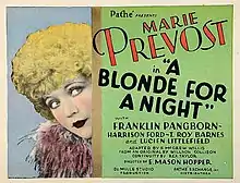 A Blonde for a Night is a 1928 American silent comedy film directed by E. Mason Hopper and F. McGrew Willis and starring Marie Prevost, Franklin Pangborn and Harrison Ford.[1]