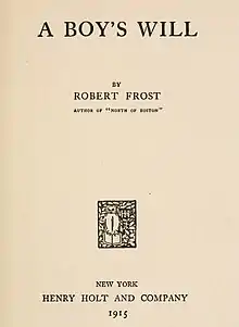A Boy's Will is a poetry collection by Robert Frost, and is the poet's first commercially published book of poems. The book was first published in 1913 by David Nutt in London, with a dedication to Frost's wife, Elinor. Its first American edition would come two years later, in 1915, through Henry Holt and Company.