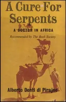 A Cure for Serpents: A Doctor in Africa is a 1955 travel book by Alberto Denti di Pirajno, later the Duke of Pirajno, an Italian doctor, writer and former colonial governor of Tripoli.[1] Set in Libya, Ethiopia and Somalia, the book is a collection of anecdotes about various places he visited in his work as a physician in North Africa in the 1920s and the people he met, which includes tribal chieftains, Berber princes, courtesans and Tuareg tribesmen and of a lioness, which became part pet and part guard.[2] The book was translated into English in the same year by Kathleen Naylor. It was republished by Eland in 2005, with an Afterword by Dervla Murphy.[3]