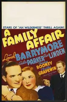 A Family Affair is a 1937 American comedy film. It was the first of 16 movies now known as the Andy Hardy series, though Andy Hardy, played by Mickey Rooney, did not become the main character in the series until a few more installments had been made. The movie features Lionel Barrymore as Judge Hardy and Spring Byington as his wife, who are Andy's parents. Barrymore and Byington were replaced in their roles by Lewis Stone and Fay Holden in the subsequent films.[2]