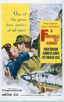 A Farewell to Arms is a 1957 American drama film directed by Charles Vidor. The screenplay by Ben Hecht, based in part on a 1930 play by Laurence Stallings, was the second feature film adaptation of Ernest Hemingway's 1929 semi-autobiographical novel of the same name. It was the last film produced by David O. Selznick.