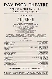 Given the outstanding success of Oklahoma! and Carousel, Allegro was anticipated with close interest by the theatre community and public.[18] The musical attracted $750,000 in advance sales, at a time when the top price ticket for a Broadway musical was $6.[19]