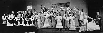 The mixed reviews prompted ongoing discussions of the play's merit, continuing well after the first night.[21] Some of the news that the show generated had nothing to do with its worth—de Mille had dancer Francis Rainer fired, and Rainer alleged that the dismissal was due to her union activism. After Actors Equity became involved, Rainer was rehired. More bad publicity came when the producers proposed to dismiss several orchestra and chorus members to cut costs so the show might continue through the summer of 1948, and the fired performers also alleged dismissal for union involvement.[22] The show closed July 11, 1948 after 315 performances,[23] and in the fall, a national tour began.[24] The national tour ran eight months, much shorter than that of Oklahoma! or Carousel. No London production was mounted. According to Thomas Hischak in his The Rodgers and Hammerstein Encyclopedia, the show made a small profit;[25] other sources state that the show lost money.[16][26]