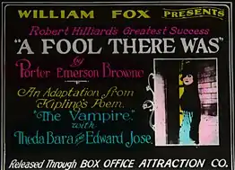 The film is based on the 1909 Broadway production A Fool There Was by Porter Emerson Browne, who in turn based his play on Rudyard Kipling's poem The Vampire.[1] Katharine Kaelred played the role of seductress, billed as "The Woman".[7] The star of the play was Victorian matinee idol Robert C. Hilliard,[7] whose name featured prominently in some advertisements for the movie though he had no connection with the film.[8]
