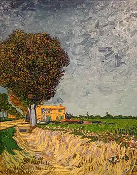 A yellow house stands at the side of the lane. The use of color in the painting is typical of Van Gogh in this period. The colors are bright and alive, lighting up the canvas and offering a view that is more perceived than experienced. The idyllic nature of the moment is thus conveyed in the use of colors.
