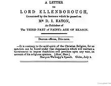 The title arises from the name of the letter's recipient, who directed the jury that convicted Eaton. Eaton had been tried and found guilty of "blasphemous libel", for being an atheist.[2] At the trial before Edward Law, 1st Baron Ellenborough, the Lord Chief Justice of England, what Mark Sandy of the University of Durham has called a "prejudiced jury" convicted Eaton for printing part three of Thomas Paine's Age of Reason.[1]