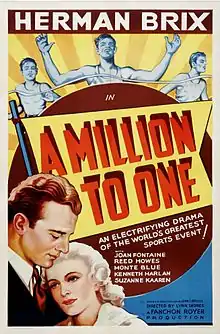 A Million to One is a 1937 American drama film directed by Lynn Shores and written by John T. Neville. The film stars Bruce Bennett, Joan Fontaine, Reed Howes, Monte Blue, Kenneth Harlan and Suzanne Kaaren. The film was released on March 3, 1937, by Puritan Pictures.[1][2]