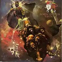 According to music critic Rick Anderson, A New Chapter of Dub incorporates traditional dub production tricks, such as delay, drop-out and echo, in ways similar to dub pioneer King Tubby, but applies the effects "in a wanton and sometimes exaggerated way" more familiar to Lee "Scratch" Perry.[1] Among the album's key characteristics are shuddering bass and reverberated brass.[6] The horn section was treated with echo, achieved both with tape and digital techniques.[7] "Flikkaflame" makes heavy use of intense snare drum echoes, while "Shining Dub" incorporates heavily flanged guitar in a fashion comparable to the Black Ark.[1] The former song, and "Zion 1", also feature harshly echoed vocals, while the softer "Truth" is driven by a hazy drum-roll beat from Dummie Zeb.[8] Designed by Paul Smykle, the album sleeve depicts a black Saviour, holding a cross, scouring heavenly skies on a chariot dragged by four roaring lions, judging "the quick and the dead", as described by Nathaniel Samuel Murrell in the book Chanting Down Babylon: The Rastafari Reader. He describes the "remarkably striking" artwork as exemplifying how album covers are "the most visible vehicle for spreading the Rasta message in art," writing that such covers transcend the "program art" category.[9]
