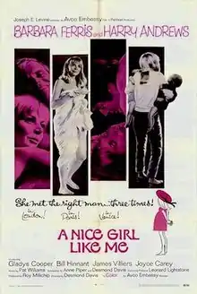 A Nice Girl Like Me is a 1969 British comedy film directed by Desmond Davis.[1] The plot revolves around a girl who lives with her shrewd aunts, goes on a trip, gets pregnant, and must lie to her aunts that the baby is not hers.[2]