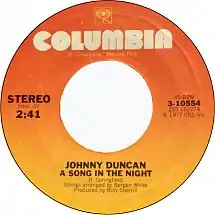 "A Song in the Night" is a country music song written by Bobby Lee Springfield, recorded by Johnny Duncan. It was the first of two singles from his 1977 LP, Come a Little Bit Closer. Harmony vocals during the last minute of the song were provided by Janie Fricke.