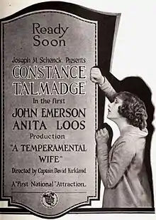 A Temperamental Wife is a 1919 silent film adventure drama directed by David Kirkland and starring Constance Talmadge, Wyndham Standing and Ben Hendricks Sr.[1] Based on a stage play entitled Information, Please, written by Jane Cowl and Jane Murfin.