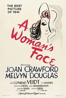 A Woman's Face is a 1941 American melodrama film directed by George Cukor and starring Joan Crawford, Melvyn Douglas and Conrad Veidt. It tells the story of Anna Holm, a facially disfigured blackmailer, who because of her appearance, despises everyone she encounters. When a plastic surgeon corrects this disfigurement, Anna becomes torn between the hope of starting a new life and a return to her dark past.[2] Most of the film is told in flashbacks as witnesses in a courtroom give their testimonies. The screenplay was written by Donald Ogden Stewart and Elliot Paul, based on the play Il était une fois... by Francis de Croisset. Another version of the story, a Swedish production, was filmed in 1938 as En kvinnas ansikte, starring Ingrid Bergman.[3]