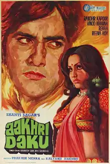 Aakhri Daku (transl. The last dacoit) is a 1978 Hindi movie produced by Shanti Sagar and directed by Prakash Mehra.[1] The film stars Randhir Kapoor, Vinod Khanna, Rekha, Reena Roy, Sujit Kumar, Ranjeet, Keshto Mukherjee and Paintal. The music to the film is by Kalyanji-Anandji.[2]