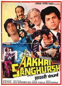 Aakhri Sanghursh is a Hindi action film of Bollywood directed by Narendra Bedi and produced by G.M. Patel. This film was made in 1982 and was ready to be released in 1986, but due to some unknown reasons, the film was finally released in 1997 in the banner of G. M. Productions and Jawahar Picture Palace.[1][2]