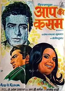 Aap Ki Kasam (English: I swear by you) is a 1974 Indian Hindi romance film produced by J. Om Prakash, which also marks his directorial debut. The film stars Rajesh Khanna, Mumtaz, Sanjeev Kumar, Rehman, Asrani and A. K. Hangal. The music is by R.D. Burman, who received the only Filmfare nomination for the film.[1] The film was successful and was declared as SuperHit at the box office,[2] and it was also acclaimed by the critics. The songs from the film, including "Jai Jai Shiv Shankar", "Zindagi Ke Safar Mein" and "Karvate Badalate Rahen", became very popular.