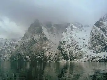 ![]() Steep rock walls dominate the landscape near Aappilattoq. |