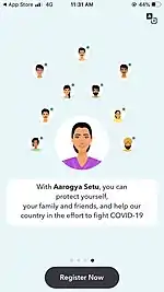 Aarogya Setu (translation from Sanskrit: the bridge to health) is an Indian COVID–19 "contact tracing, syndromic mapping and self-assessment" digital service, primarily a mobile app, developed by the National Informatics Centre under the Ministry of Electronics and Information Technology (MeitY). The app reached more than 100 million installs in 40 days. On 26 May, amid growing privacy and security concerns, the source code of the app was made public.[3]