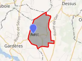 The village is situated on the plateau of Ger and is composed of a dozen scattered houses. Aast is 20 km east of Pau and 20 km north of Lourdes. Access to the commune is by road D70 then D311 north-east from Gardères, road D64 north-west from Ger, and road D311 when coming south from Ponson-Dessus. Other country roads can also be used to access the commune.[4]