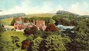 Abbot's Wood was a large complex building, incorporating elements of Gothic and Tudor architecture. There were many gables and roofs, a square tower with a taller stair turret and a particularly long conservatory.[1] Of the surviving estate buildings, three are recorded in the National Heritage List for England as designated Grade II listed buildings; two of the lodges and the home farm. The North Lodge, with its attached gatehouse and wing walls, is constructed in sandstone, and is in Gothic Revival style. The gatehouse has two storeys, with an archway in the lower storey. The upper storey contains a niche for a statue, which is flanked by a single-light window on each side. The single-bay gabled lodge to the right has a red tiled roof, and mullioned and transomed windows.[14] The South Lodge is half-timbered on a sandstone plinth, and has a red tiled roof. It is in two storeys, the front being gabled with a decorated bargeboard. The windows are transomed casements, and there is a four-light oriel window on the left side.[15] The Home Farm is built in sandstone with red tiled roofs. It consists of a cottage with a single storey and an attic, a shippon and calf house, a barn, pigsties, a stable, and a cart shed. These are all set in a U-shape around a courtyard.[16]
