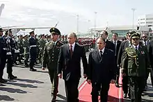 Bouteflika presided over the Organisation of African Unity in 2000, secured the Algiers Peace Treaty between Eritrea and Ethiopia, and supported peace efforts in the African Great Lakes region.[25] He also secured a friendship treaty with nearby Spain in 2002, and welcomed president Jacques Chirac of France on a state visit to Algiers in 2003.[26][27] This was intended as a prelude to the signature of a friendship treaty.[27]
