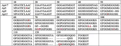 Peptide sequences such as MGGG, FGGMG, FGGMGGG, GGFGGMGGG, and FGGMGGGNAG are repeated throughout the peptide chain.[3] It is to note that these peptide sequences all contain glycine. Additionally, in Argopecten irradians, the pentapeptide FGGMG is repeated throughout the molecule.[5] The main peptide sequence feature of abductin is the presence of many repeating sequences, all of which contain glycine residues. This is similar to that of the structure of elastin.